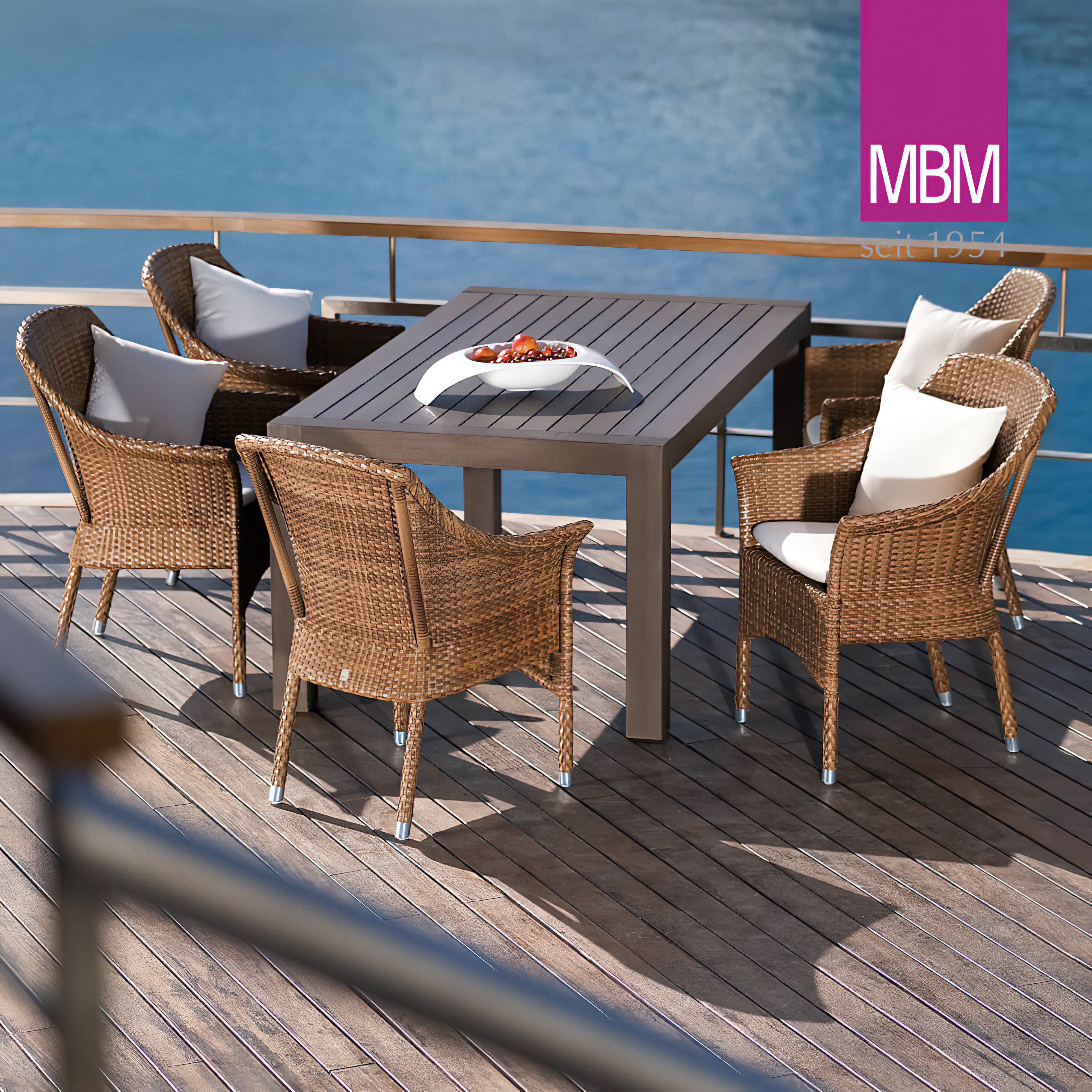 La serie di mobili da giardino Bellini รจ realizzata in alluminio di alta qualitร e in una trama di plastica marrone (Mirotex), sviluppata appositamente da MBM. Nell'aspetto e al tatto, questa trama non ha nulla da invidiare al vero rattan, ma รจ molto piรน facile da mantenere e piรน resistente. Qui puoi davvero rilassarti con tranquillitร e goderti l'estate. La pulizia si effettua con normali detergenti domestici.