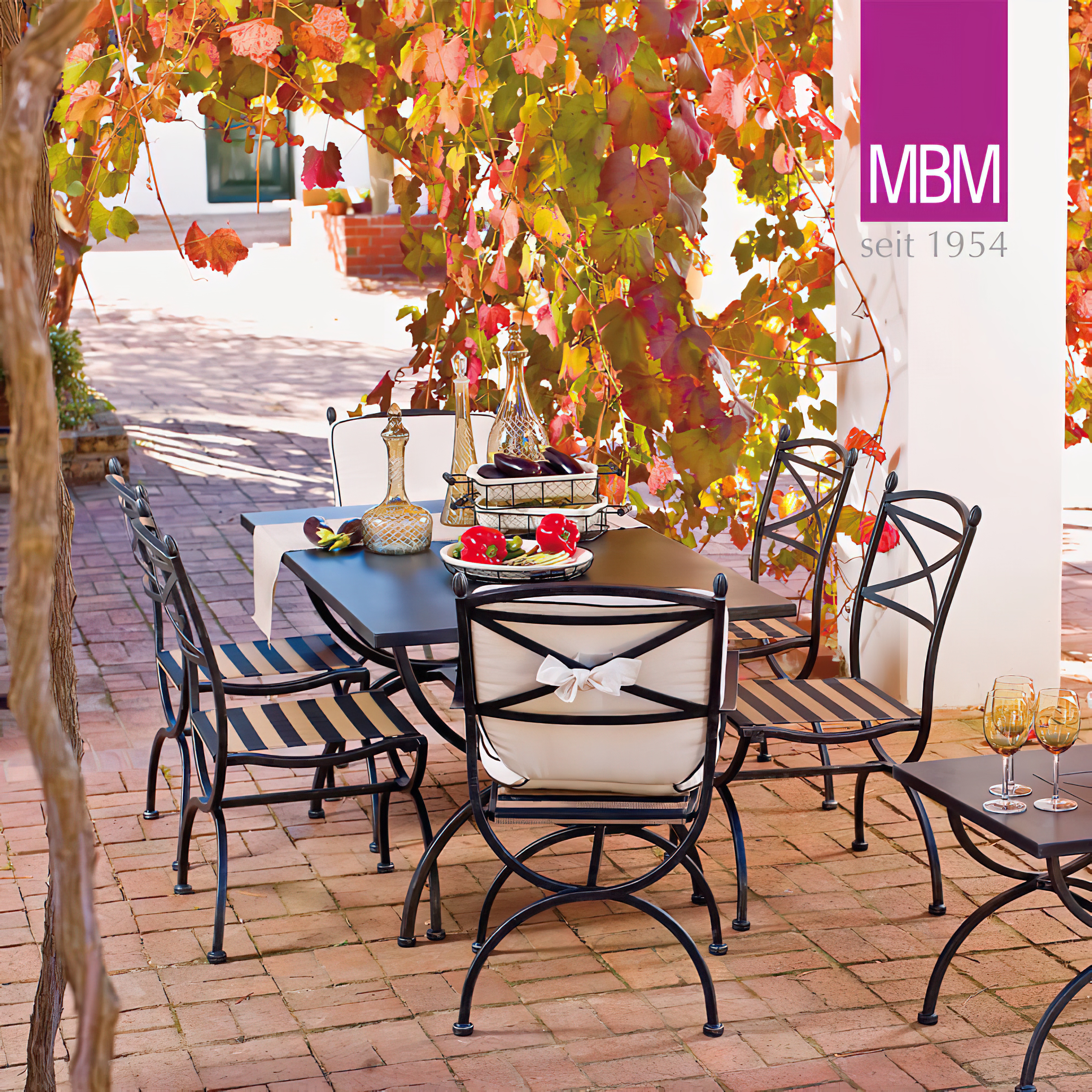 I mobili da giardino della collezione Medici sono realizzati in ferro battuto massiccio. Con sottili influenze antiche, tavoli, sedie e lettini prendisole creano un'atmosfera romantica in quasi ogni ambiente. Dietro la forma classica si cela una tecnologia all'avanguardia. Il ferro è zincato galvanicamente e protetto da una verniciatura a polvere nera antica. Anche la stoffa a righe nere in textilene si armonizza perfettamente con il design mediterraneo dei mobili.