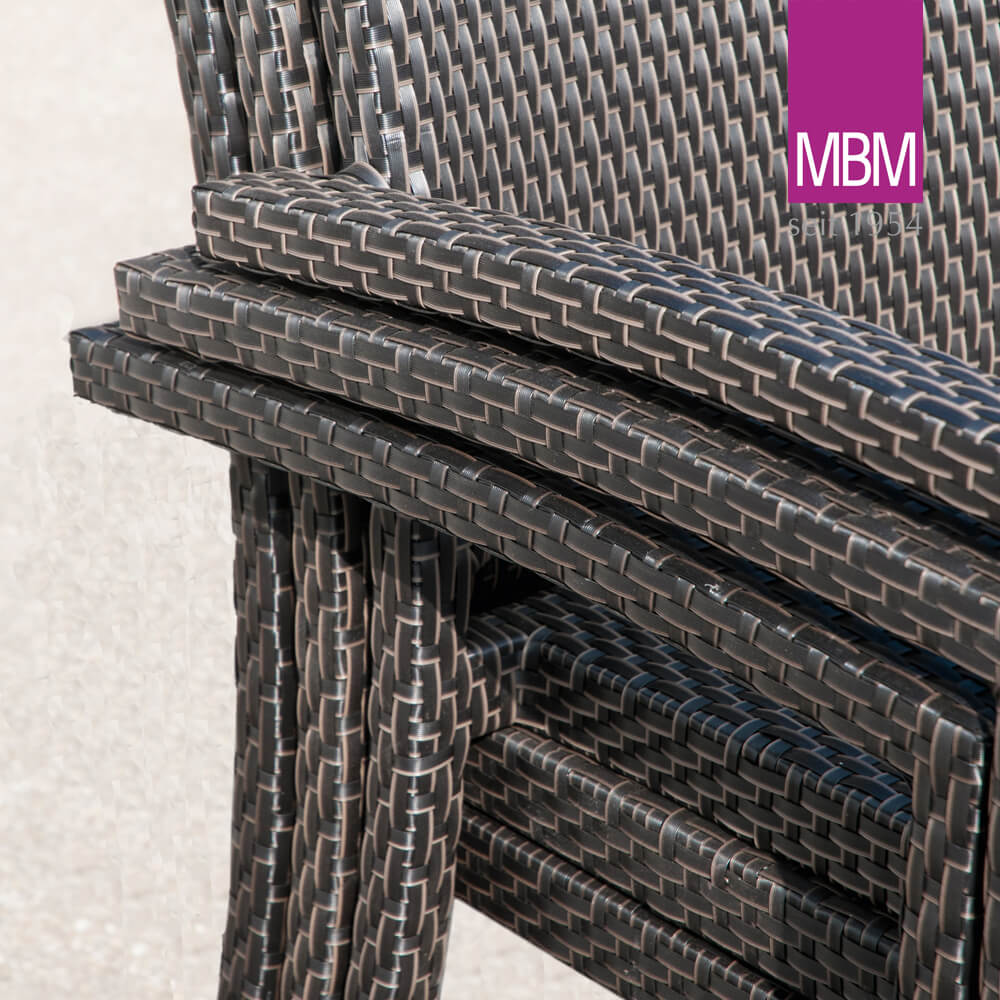La serie di mobili da giardino Bellini è realizzata in alluminio di alta qualità e un intreccio in plastica marrone (Mirotex), sviluppato appositamente da MBM. Nell'aspetto e al tatto, l'intreccio non ha nulla da invidiare al vero rattan, ma è molto più facile da mantenere e durevole. Qui puoi davvero rilassarti con tranquillità e goderti l'estate. La pulizia si effettua con normali detergenti domestici.