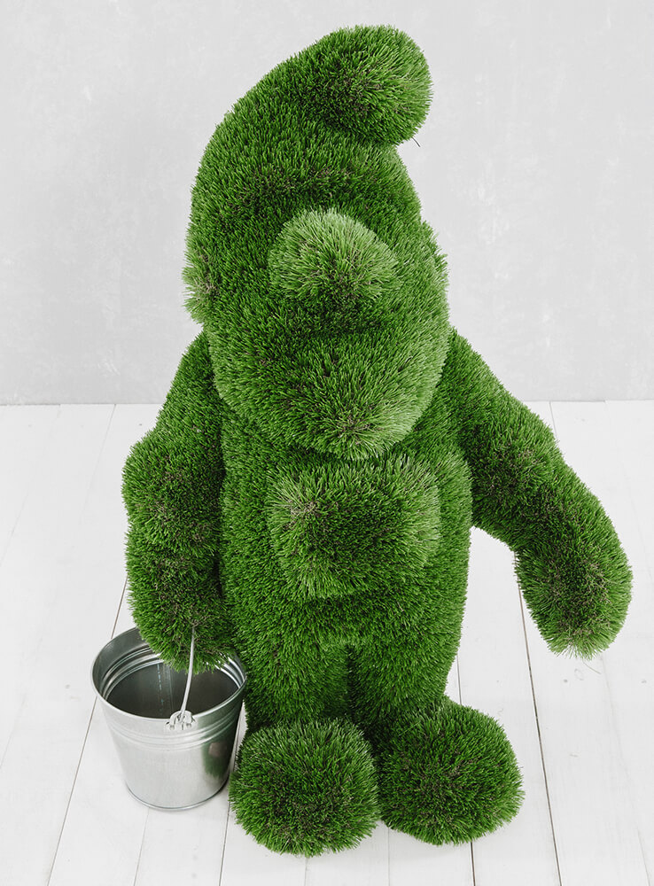 Tutte le figure vengono create come modelli 3D al computer. Successivamente, la struttura in fibra di vetro viene realizzata e rivestita a mano con erba sintetica. Ogni scultura è quindi un pezzo unico. Grazie alla struttura in fibra di vetro, i topiary sono particolarmente leggeri, resistenti agli urti e durevoli - inoltre sono privi di ruggine, resistenti alla corrosione, alle temperature e ai raggi UV. Non sono necessarie ulteriori operazioni di manutenzione. Il peso delle figure sagomate varia tra 30 e 250 kg. È importante posizionare le sculture lontano da fonti di calore o fuoco.