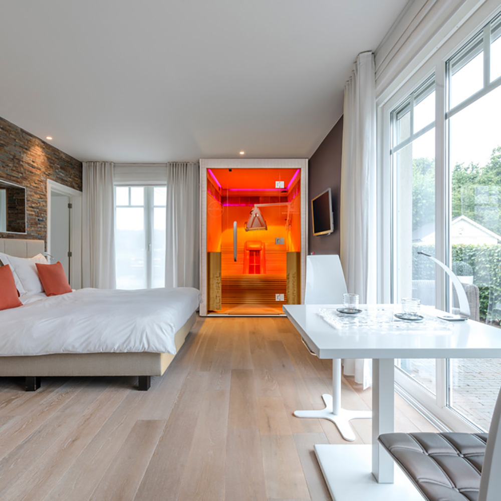 Holz Infrarotkabine mit patentierten IR Loungebänken für zwei Personen - Sherin / ohne Beauty Light