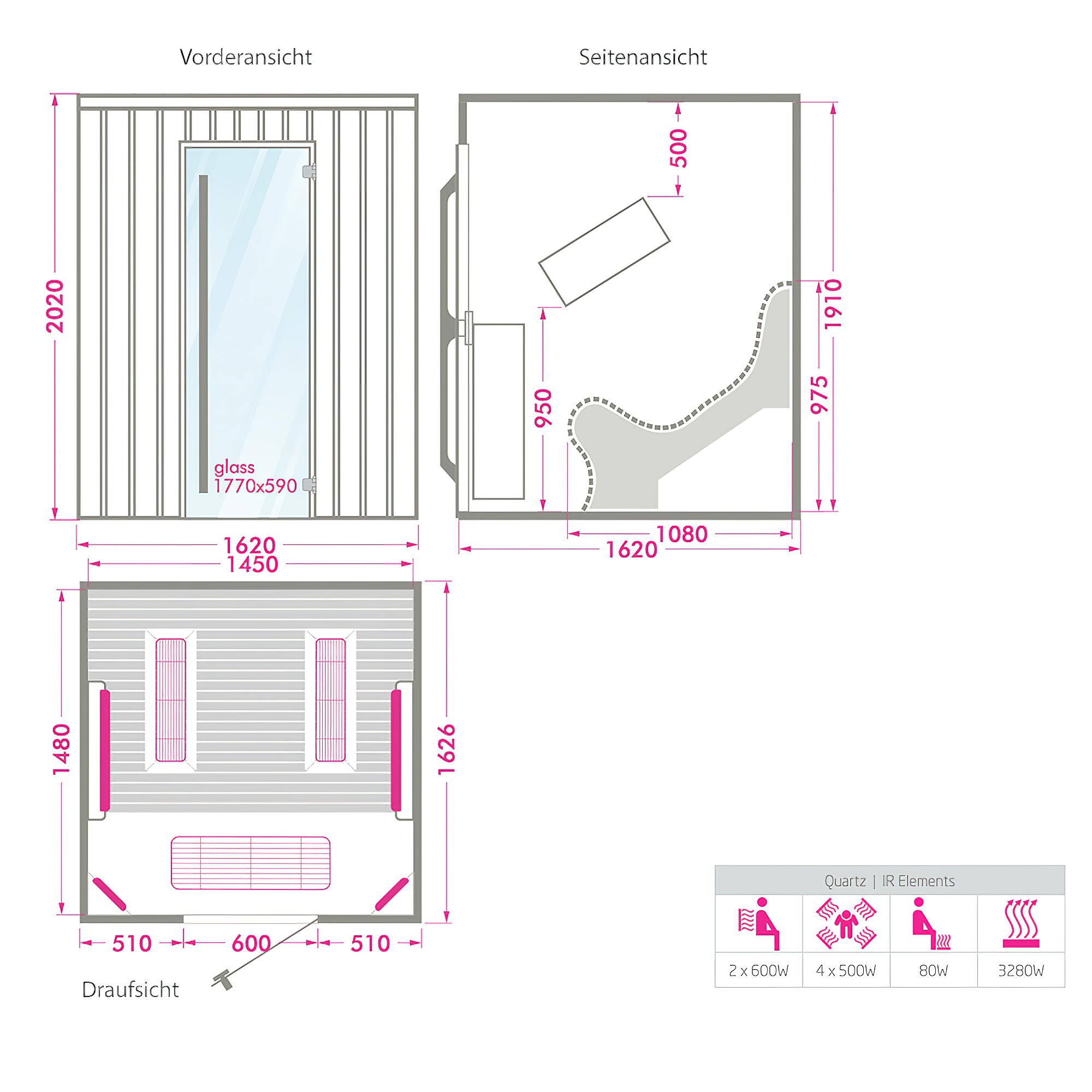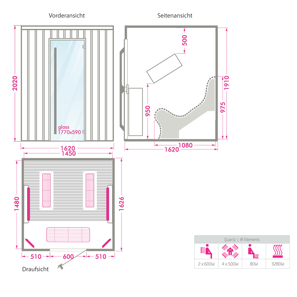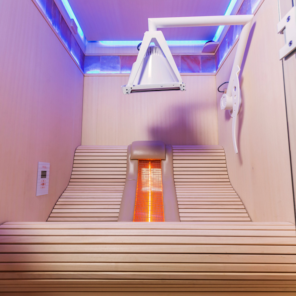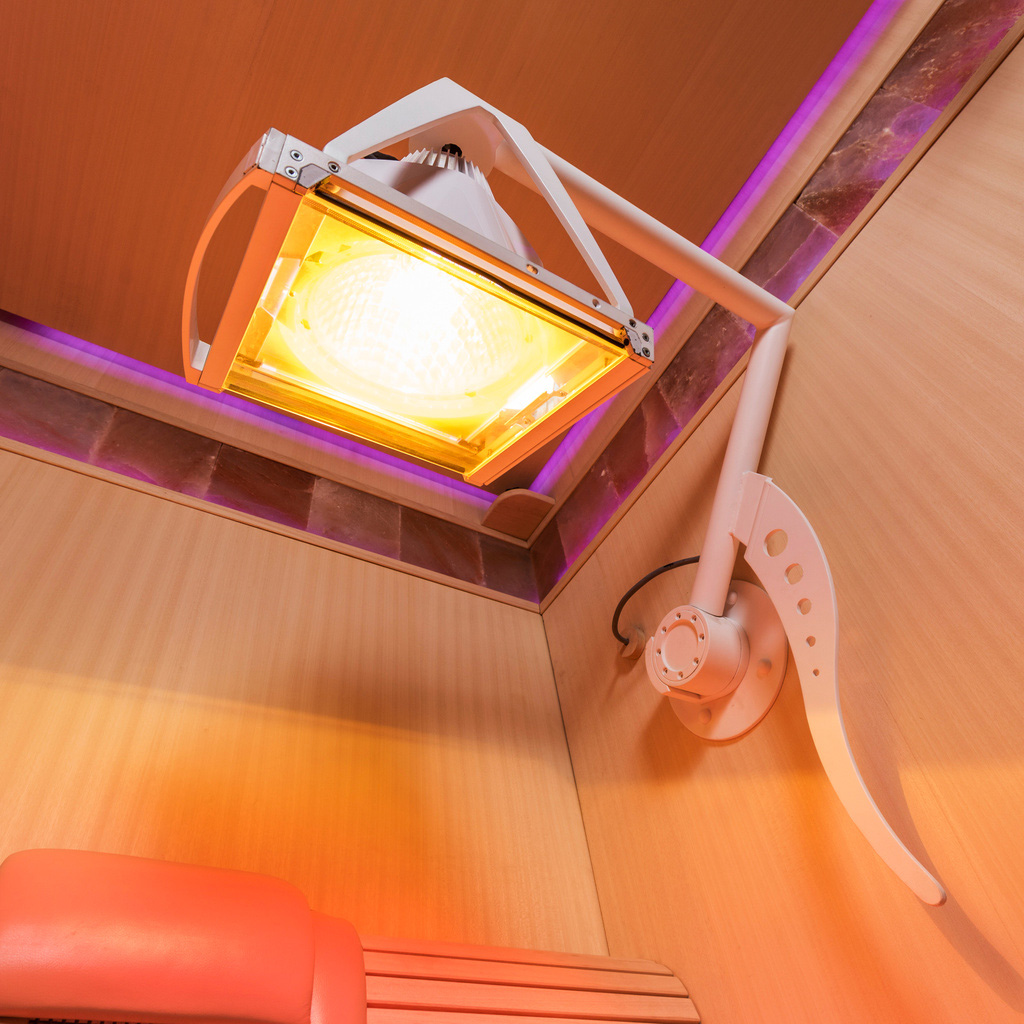 La cabina a infrarossi è dotata di un equipaggiamento completo e ricco di funzionalità. Alcuni componenti possono essere scelti da voi. Sono possibili ulteriori personalizzazioni e soluzioni benessere su misura. Ecco una panoramica dell'equipaggiamento standard:
