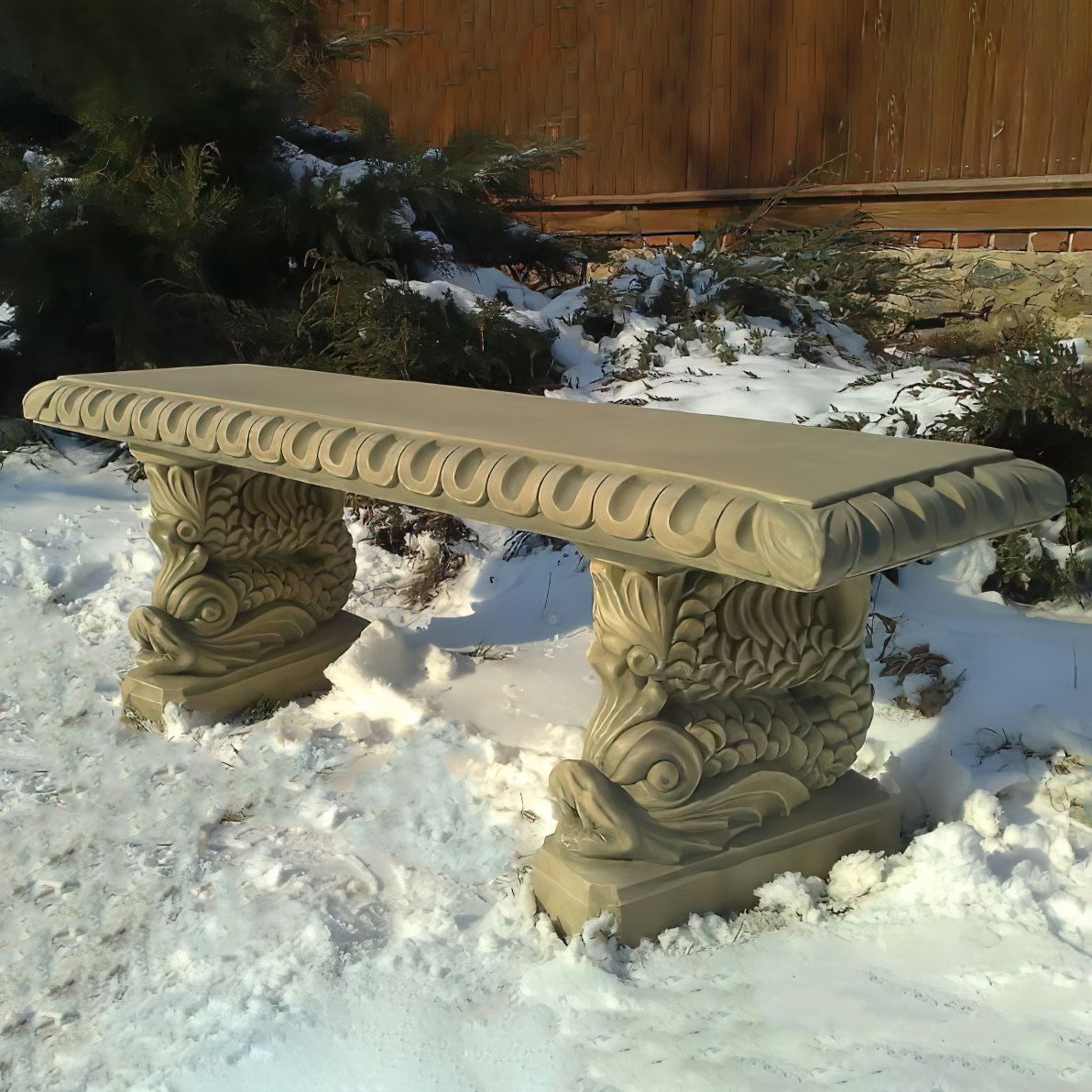 Kunstvolle Gartenbank aus Steinguss mit detailreicher Fisch Verzierung - Sinon / Calabria