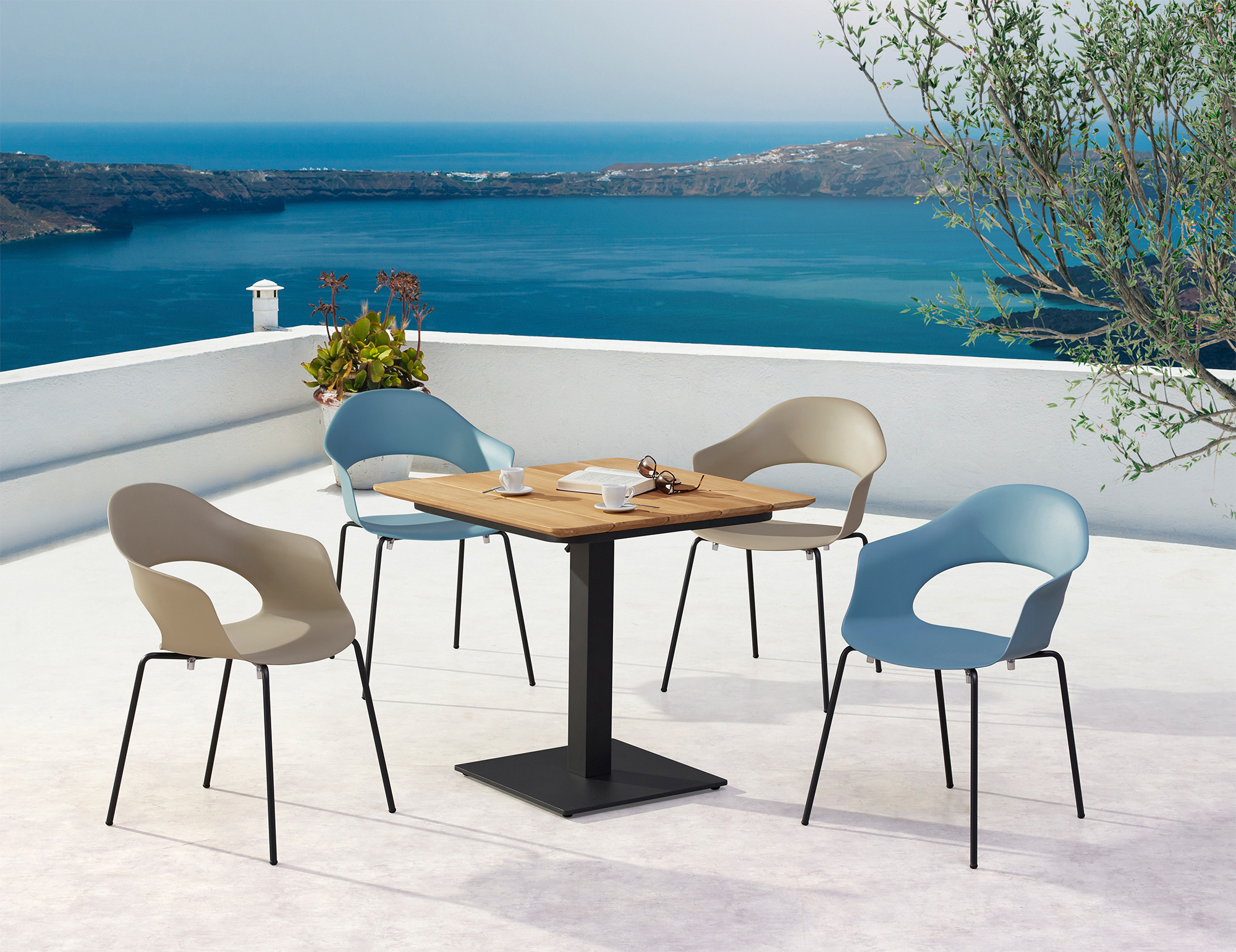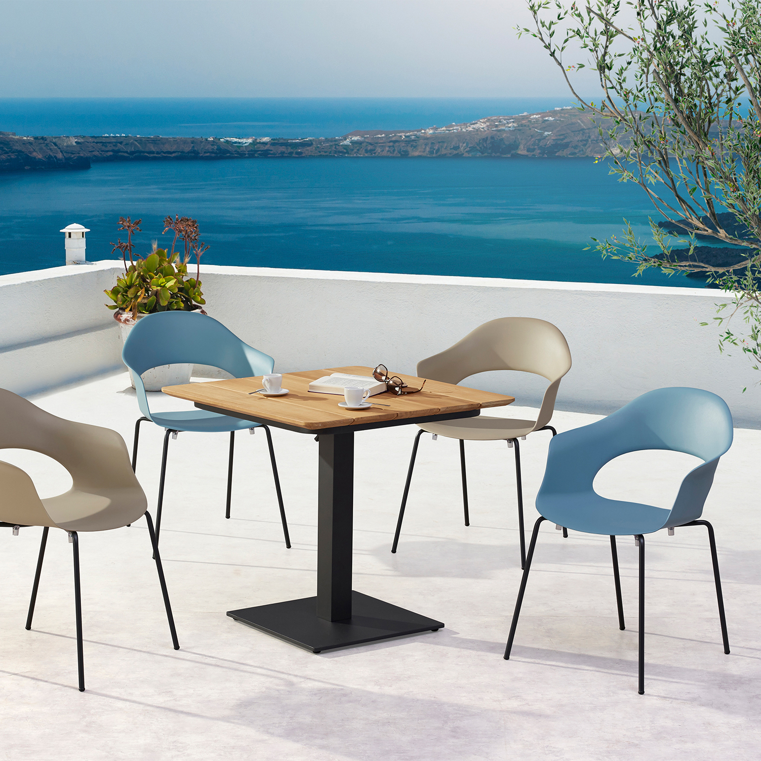 I nostri mobili da giardino di alta qualità si distinguono per la loro grande resistenza alle intemperie. Che siano posizionati sul balcone, sulla terrazza o nel giardino, il set da seduta colpisce per il suo design raffinato. Il tavolo da esterno è realizzato in alluminio con verniciatura colorata. Il piano del tavolo richiudibile è in legno di teak. Le viti di regolazione alla base garantiscono una stabilità sicura anche su superfici irregolari. Il set viene consegnato smontato con istruzioni di montaggio. Le sedie da giardino sono costruite con una struttura in tubo d'acciaio zincato e plastica rinforzata con fibra di vetro, con uno schienale alto 38 cm.