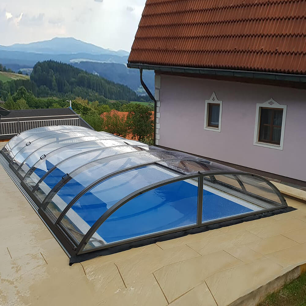 Niedrige Poolabdeckung als Sonderanfertigung - mit Seitentür - Aluminium & Polycarbonat - Olivin Flach / 2 Segmente - 372x430cm (BxL)