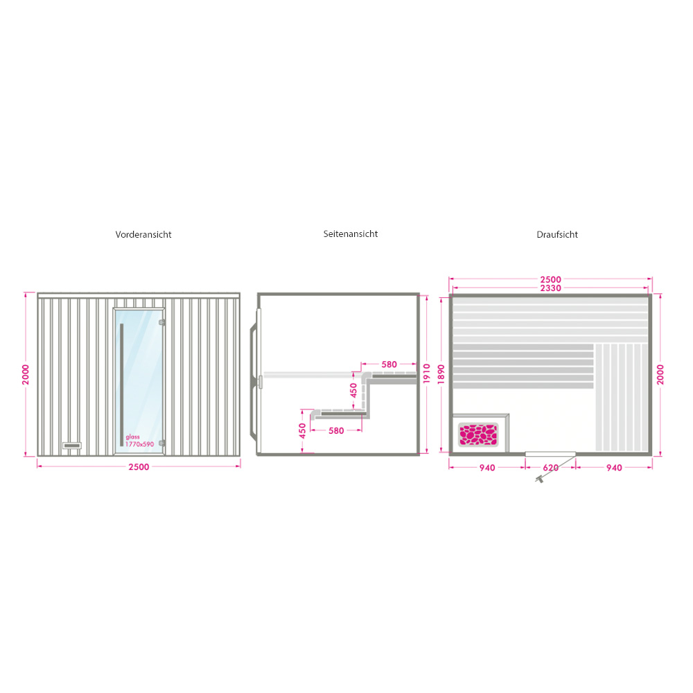 Vollausgestattete Indoor Sauna aus Holz in verschiedenen Größen mit Glastür - Visal / 250x200cm (BxT) / 3-6 Personen
