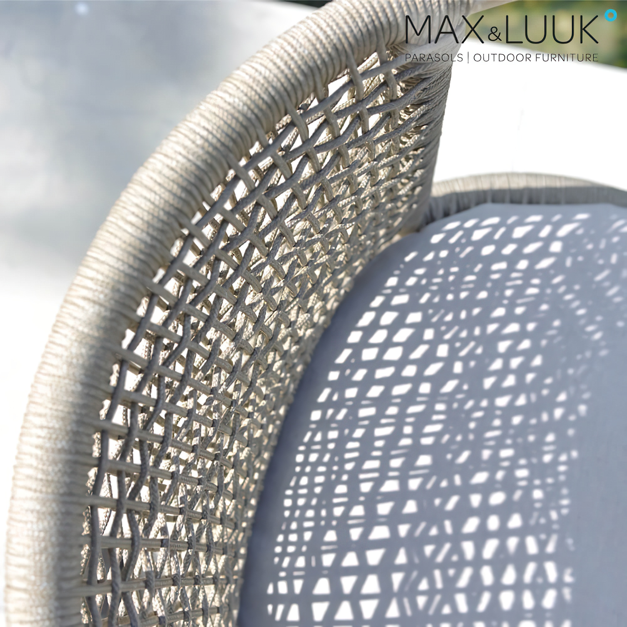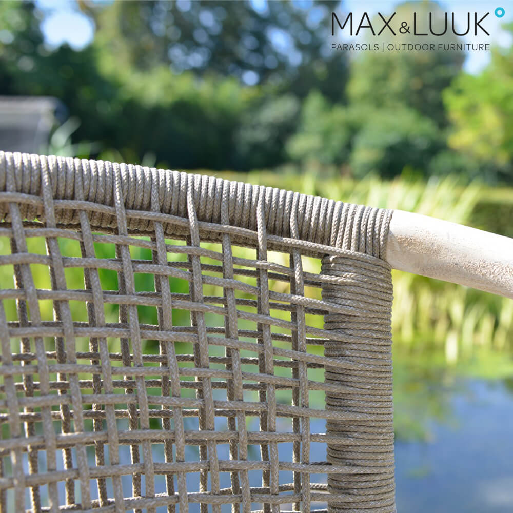 La seduta e lo schienale del mobile da giardino sono rivestiti con una corda per tutte le condizioni atmosferiche. Si tratta di un materiale innovativo e resistente che conferisce ai mobili Max & Luuk un design moderno e accattivante. La corda morbida aumenta il comfort di seduta. È composta da fibre di polipropilene termoplastico e soddisfa tutti i requisiti importanti per i mobili da giardino. Il rivestimento è resistente all'umidità , ai raggi UV, ai lavaggi, ai cambiamenti di temperatura ed è particolarmente facile da mantenere. Il tessuto non contiene PVC ed è resistente a muffa e funghi. Non si consiglia la pulizia con idropulitrice. È preferibile prendersi cura delle fibre con detergente e protettore specifici per tessuti.