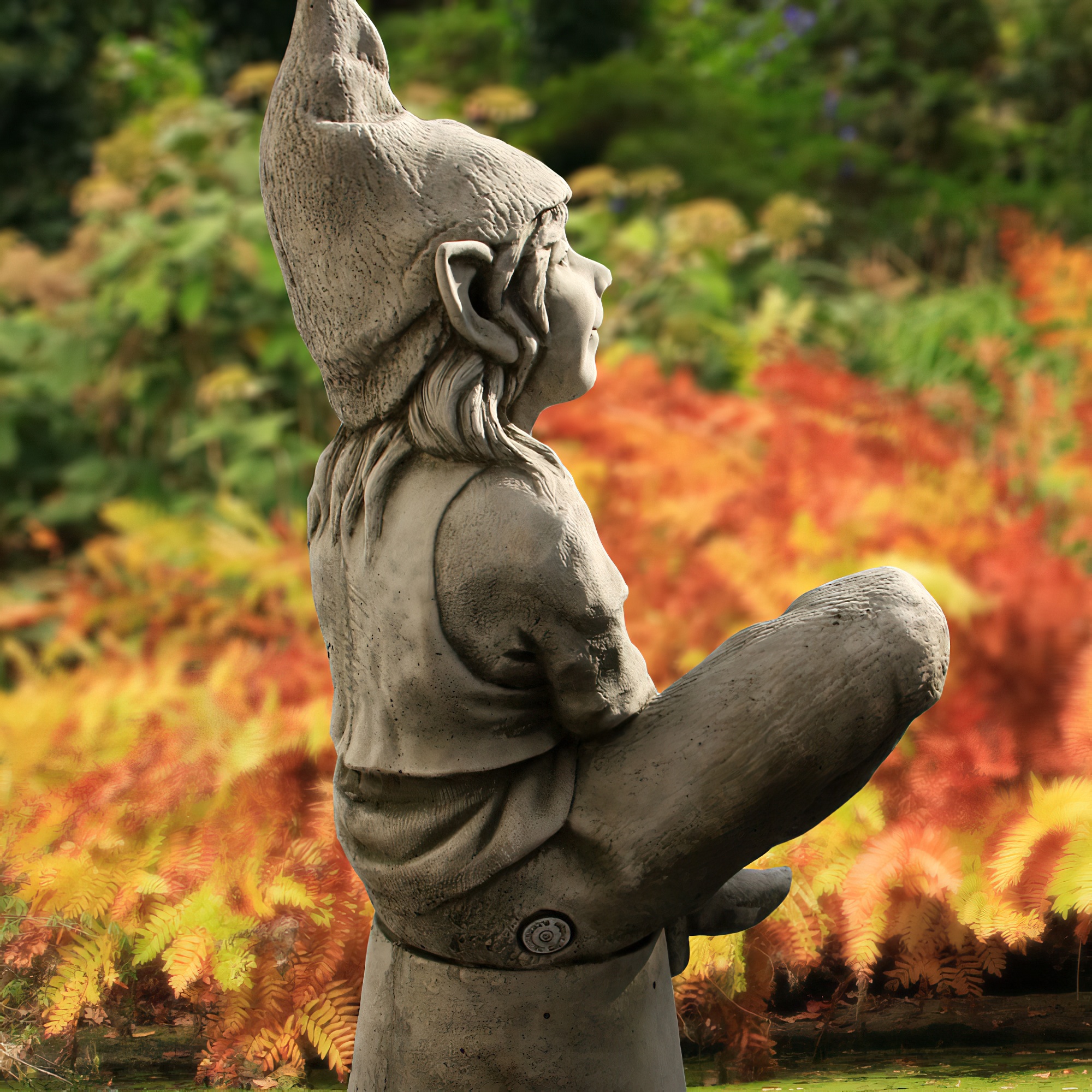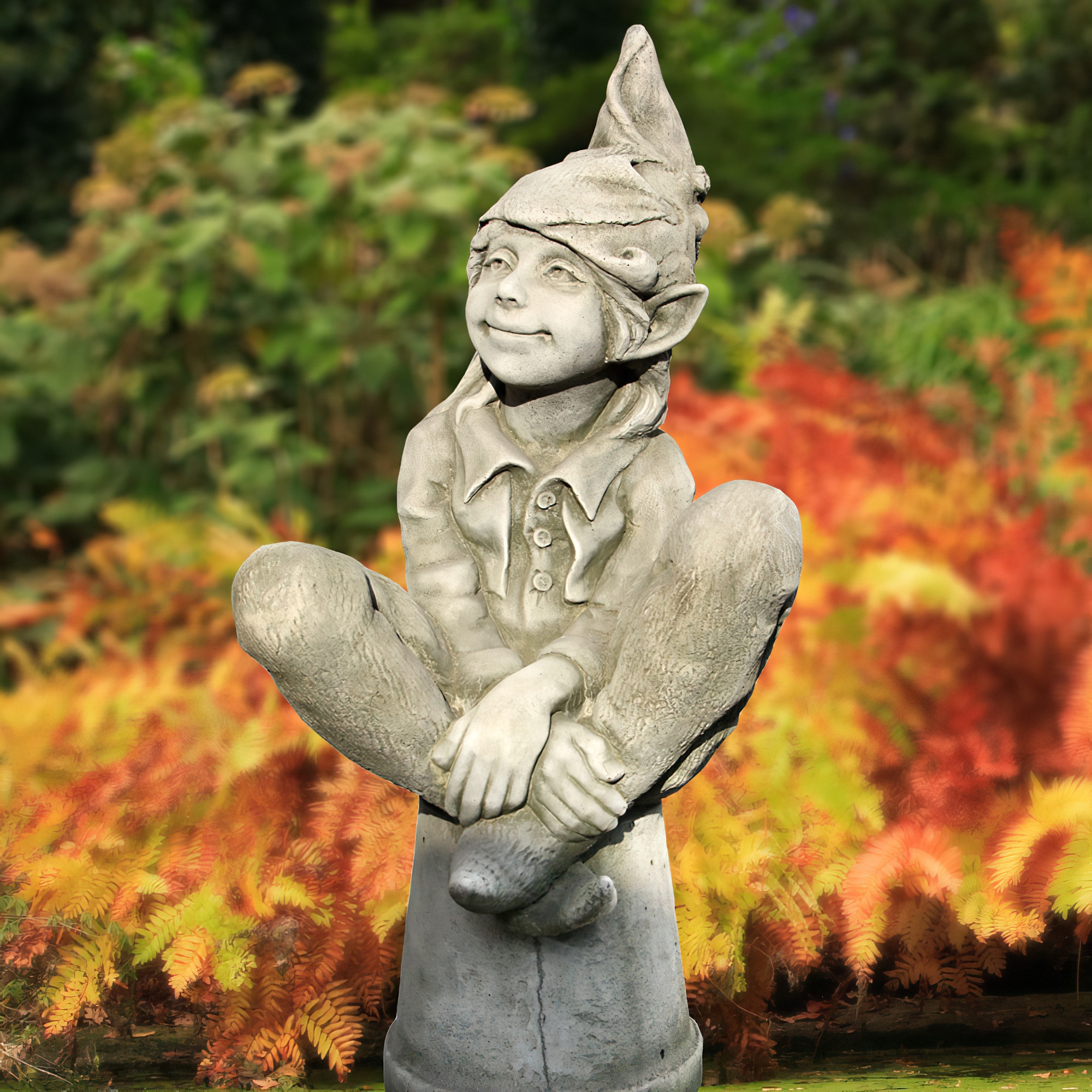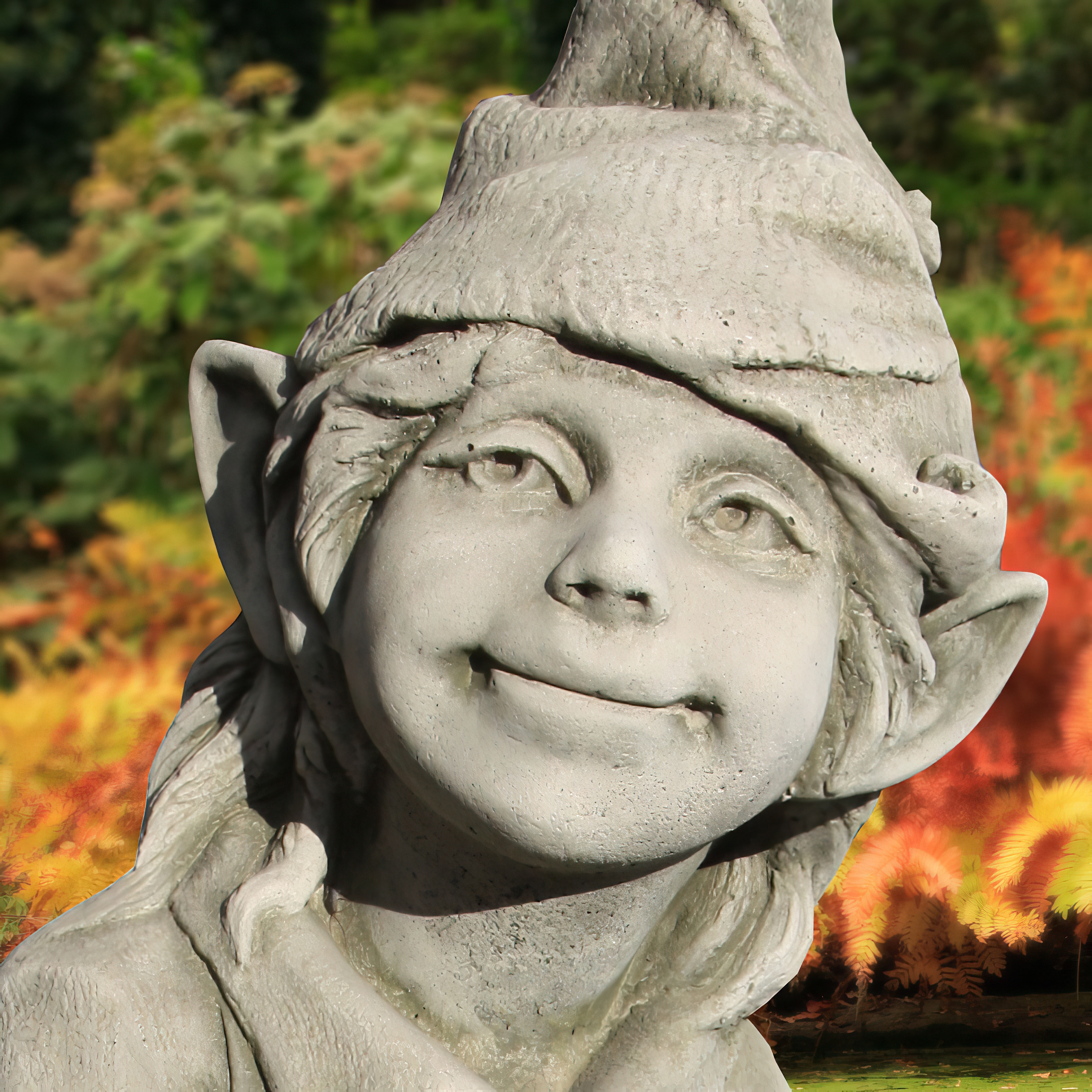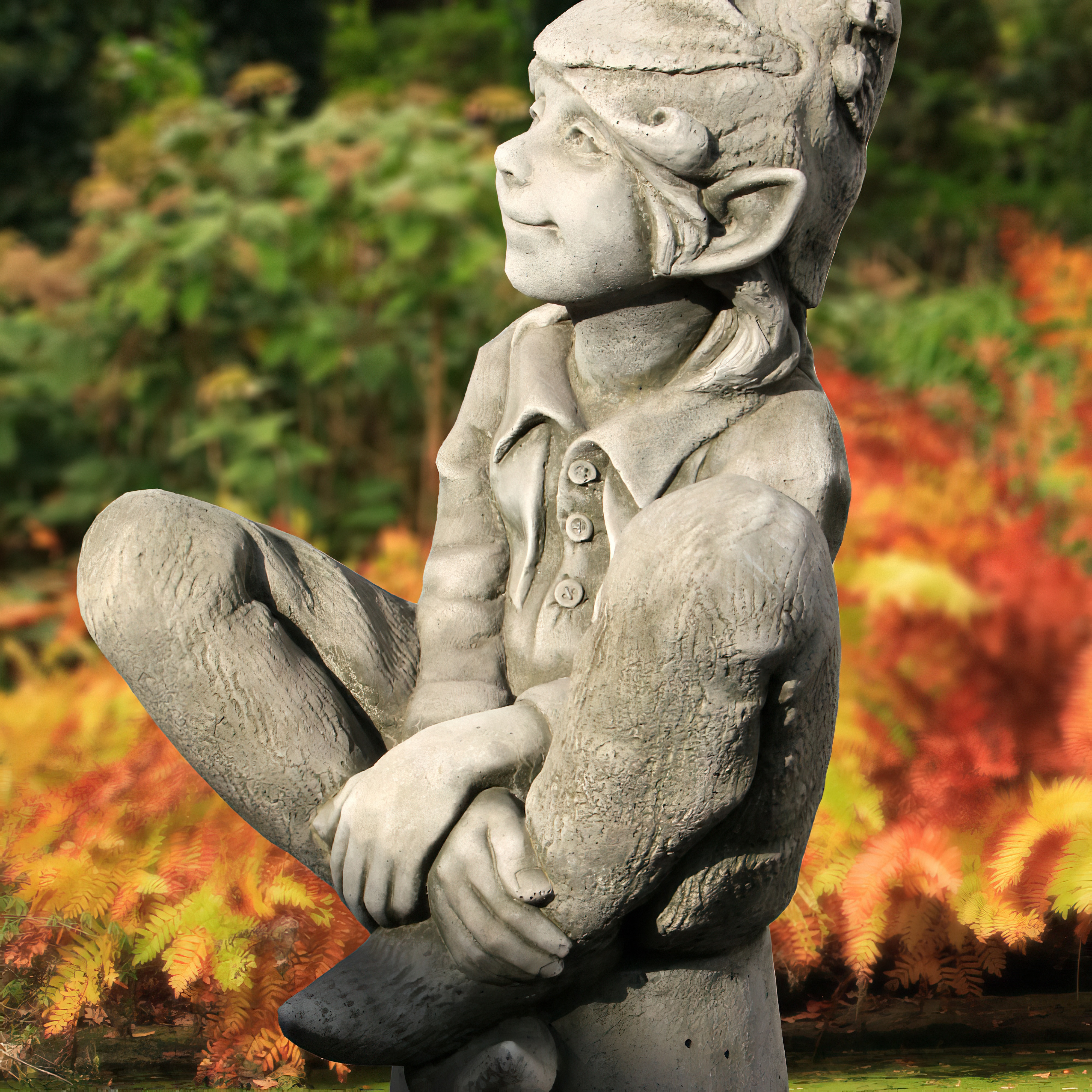 Diese hübsche Gartenelfe aus Steinguss zaubert jedem Betrachter ein Lächeln ins Gesicht. Ob bei Regen oder Sonnenschein – die wetterfeste Elfe Susan sorgt für gute Stimmung in jedem Garten. Auf einem Blumentopf sitzend und mit einem charmanten Lachen im Gesicht wirkt es, als könnte die kleine Steinelfe jederzeit aufspringen und durch den Garten flitzen. Frech hat sie die Beine angezogen, die Arme verschränkt und den Hut lässig ins Gesicht gezogen – so bewacht die sitzende Elfe Blumen und Beete. Die spitzen Ohren und die zierliche Gestalt sind typisch für die moderne Elfe. Mit vielen liebevollen Details überzeugt dieser hellgraue Steinwichtel aus der bekannten Bildhauerei Pheeberts. Die kleine Gartenelfe "Susan" aus Steinguss ist winterhart und witterungsbeständig, sodass sie das ganze Jahr über draussen bleiben kann. Mit einer Höhe von rund 60 Zentimetern und einer Breite von 32 Zentimetern bringt sie auch in kleineren Gärten ihren Charme zum Ausdruck. Ob am Blumenbeet, in der Lieblings-Ecke, am Gartenteich oder zwischen rankenden Pflanzen – die Gartenelfe Susan verzaubert jeden Platz im Garten.